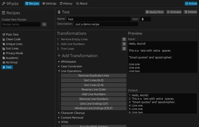 9paste uživateli nabízí více než 40 předdefinovaných úprav (transformací) textu. Jedná se například o normalizaci mezer, úpravu velikosti písma a práci s řádky nebo o odstranění citlivých údajů či markdown a HTML syntaxe. Definice transformací lze také přepínat, kombinovat a používat buď automaticky na pozadí nebo manuálně pomocí příkazů.