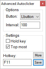 Advanced Autoclicker je malý a nenáročný nástroj, který simuluje klikání myši v nastaveném pravidelném časovém intervalu. Nastavit lze klikání pravého, levého i prostředního tlačítka myši. Simulovat lze klikání až o frekvenci více než 500 CPS (Clicks per Second).