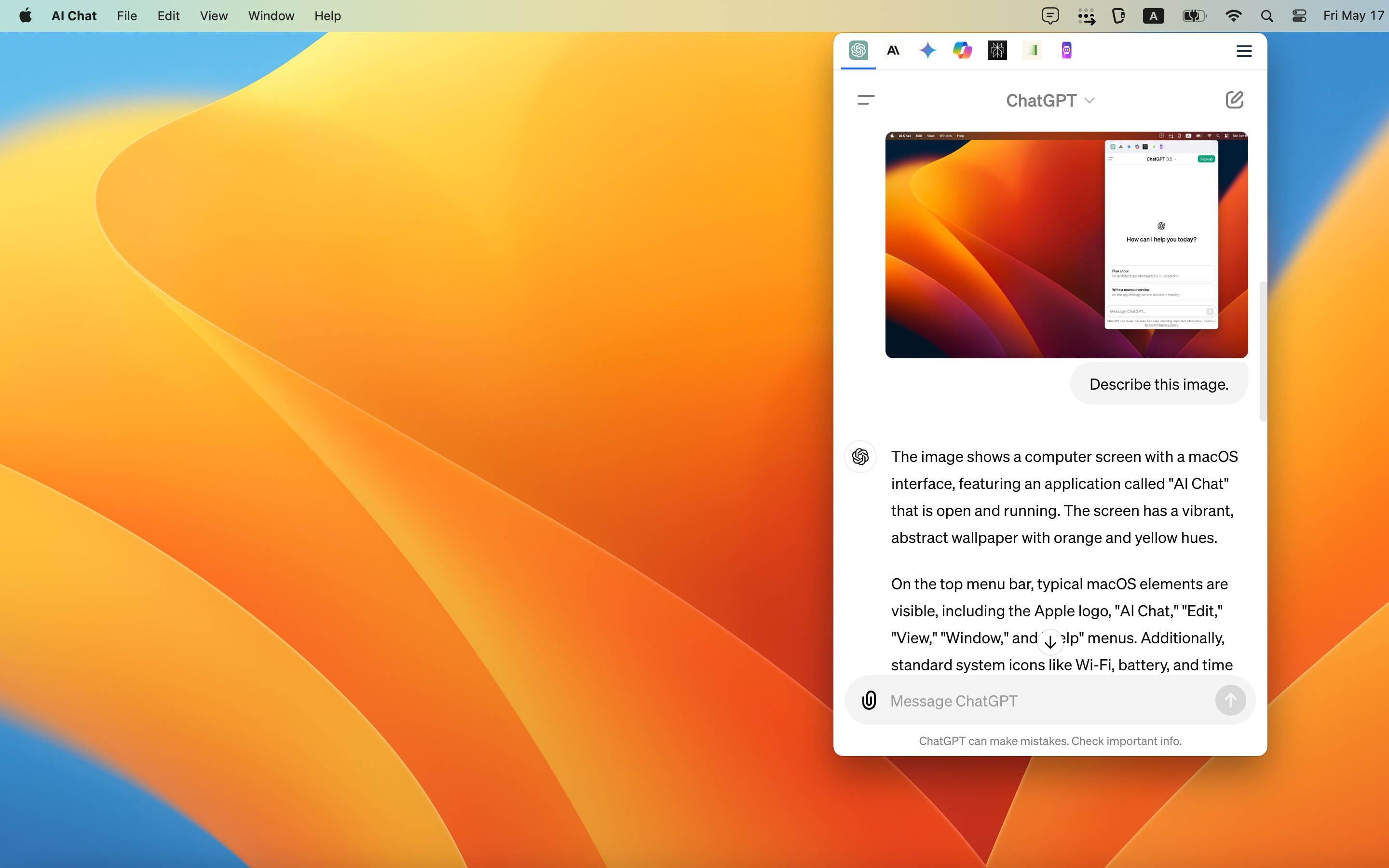 AI Chat je multiplatformní desktopová aplikace pro snadnou komunikaci s AI technologií ChatGP. Přístup k programu je možný přímo z nástrojové lišty systému respektive z oblasti menu baru v macOS.