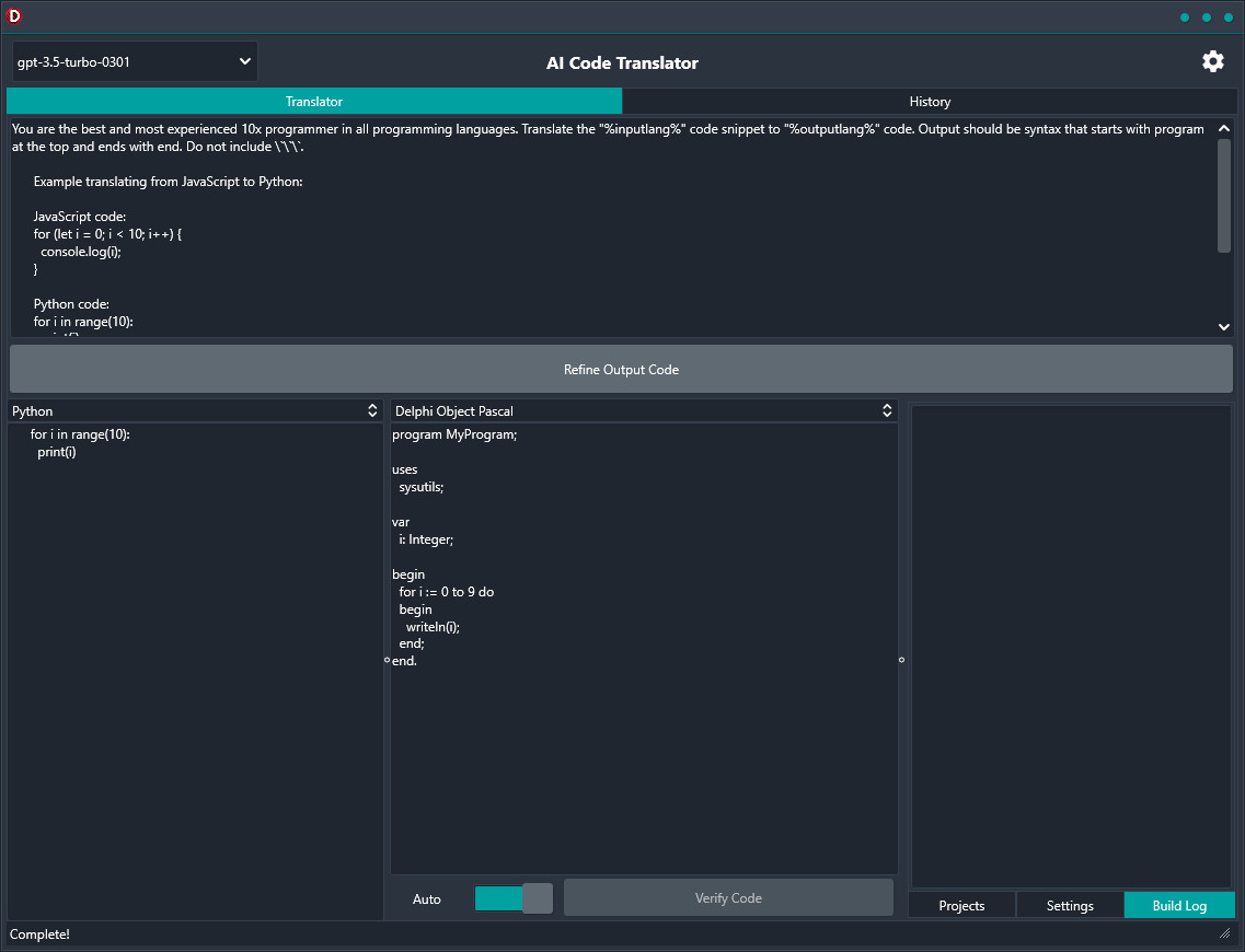 AI Code Translator je užitečný pomocní pro vzájemný převod respektive překlad zdrojového kódu programů mezi různými programovacími jazyky pomocí umělé inteligence (AI) ChatGPT.