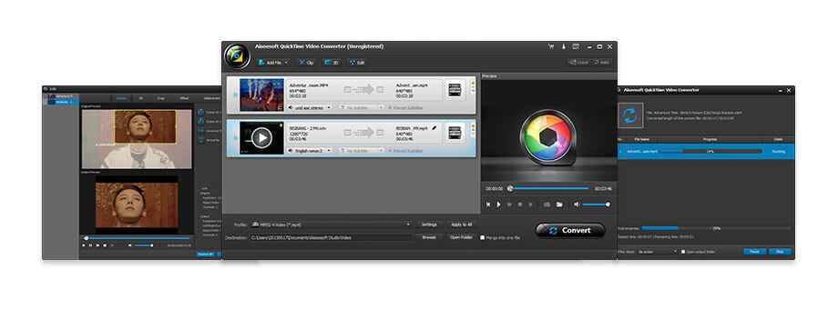 Aiseesoft QuickTime Video Converter je nástroj pro konverzi videí typu MP4, AVI, M4V, MPEG, FLV, MKV, VOB, WebM do formátu QuickTime (MOV). Podporován je převod videí s kvalitou SD, 1080p HD a 4K UHD. Užitečnou funkcí je rovněž možnost extrakce audio stop z podporovaných videí a jejich uložení do souborů typu AAC, AIFF, MP3, M4A, WAV, FLAC a dalších. Samozřejmostí je možnost dávkové konverze.