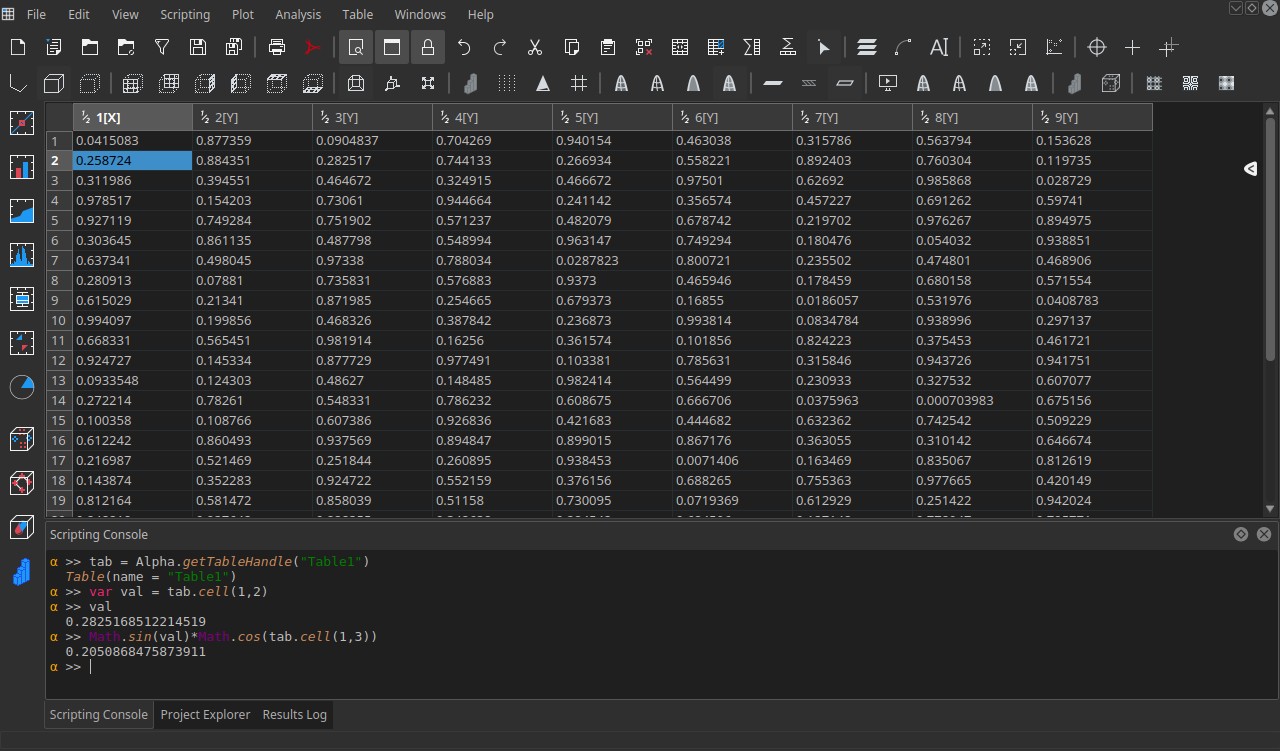 AlphaPlot je nástroj sloužící pro snadné generování přehledných 2D i 3D grafů z různých statistických údajů. Uživatel může využít jak externího zdroje dat, tak i vestavěného tabulkového procesoru. Vytvořené grafy lze samozřejmě snadno vytisknout nebo exportovat do souborů ve formátech PDF, SCG a ESP.