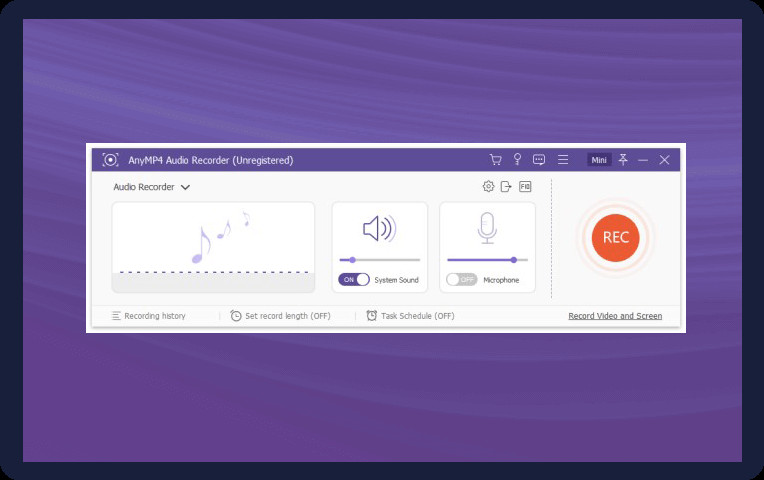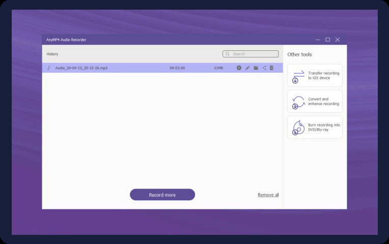 AnyMP4 Audio Recorder je aplikace sloužící pro záznam zvuku či hudby z libovolného audio vstupu včetně mikrofonu do souborů typu MP3, M4A, WAV, AAC a dalších. Samozřejmostí je možnost přehrávání audio záznamů a nastavení kvality výstupních audio souborů.