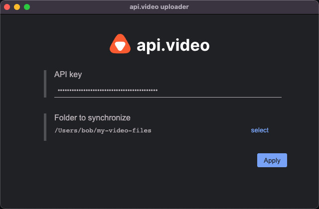 api.video Desktop Synchronizer je pomůcka sloužící pro synchronizaci složky, která obsahuje video soubory s online službou api.video. Pro bezproblémový upload videí program vyžaduje vygenerování a zadání API klíče služby api.video a nastavení zdrojové lokální složky.