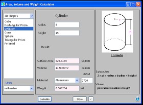 Area, Volume and Weight Calculator je užitečná kalkulačka pro výpočet obsahu respektive povrchu, objemu a hmotnosti rovinných i objemových těles. K dispozici jsou výpočty čtverce, trojúhelníku, lichoběžníku, kružnice, kvádru, válce, kužele, koule a mnoha dalších objemových i rovinných těles. Kromě výsledků má uživatel k dispozici i vzorec pro výpočet požadovaných vlastností.