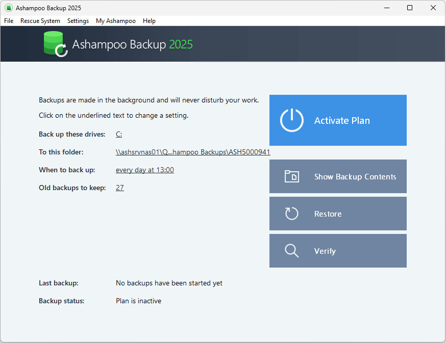Ashampoo Backup 2025 je profesionální aplikace sloužící pro kompletní zálohování a případnou obnovu celých diskových oddílů. Přírůstková automatická aktualizace záloh zajišťuje, že záložní soubory jsou vždy aktuální a zabraňují ztrátě dat. Zálohy jsou vždy obnovitelné, a to i v případě vysoce poškozených systémů nebo systémů napadených ransomwarem, a to díky vestavěné záchranné funkci, která nevyžaduje žádné technické znalosti.