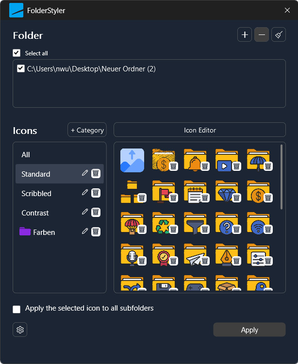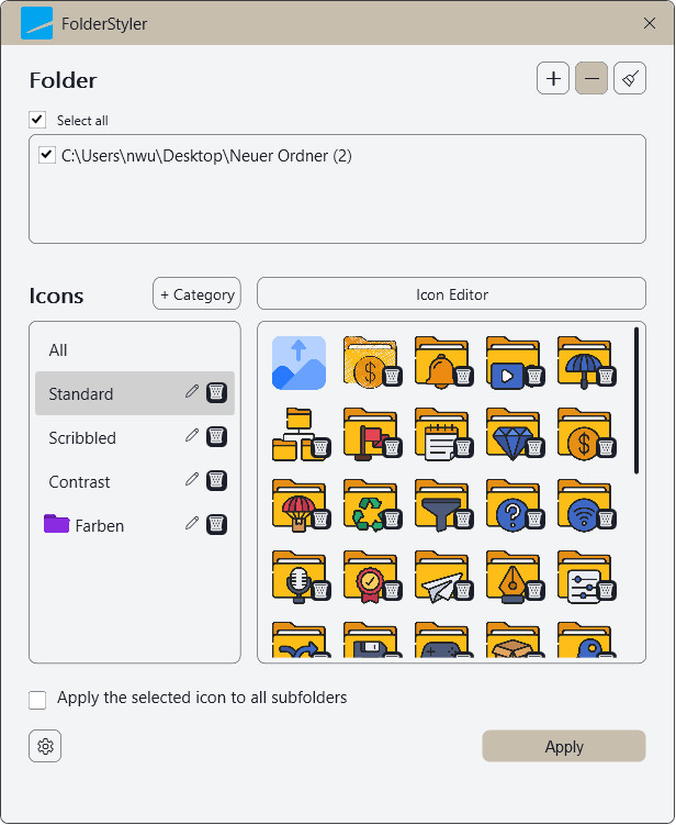 Integrovaný editor ikon zajišťuje perfektní vzhled složek a intuitivní rozhraní umožňuje rychlé a snadné přizpůsobení, což umožňuje použít styly složek i na podsložky. Široká škála připravených návrhů, od jednoduchých vzorů až po kreativní symboly, pak nabízí nekonečné možnosti.