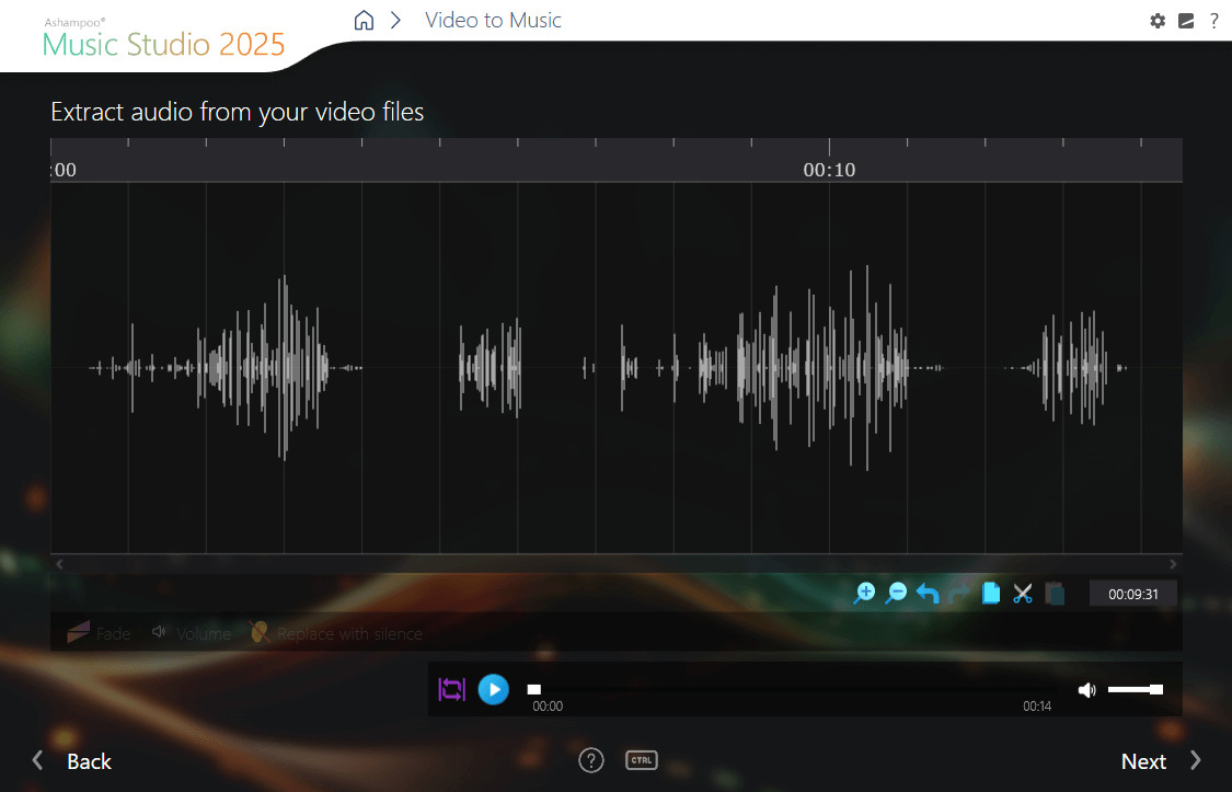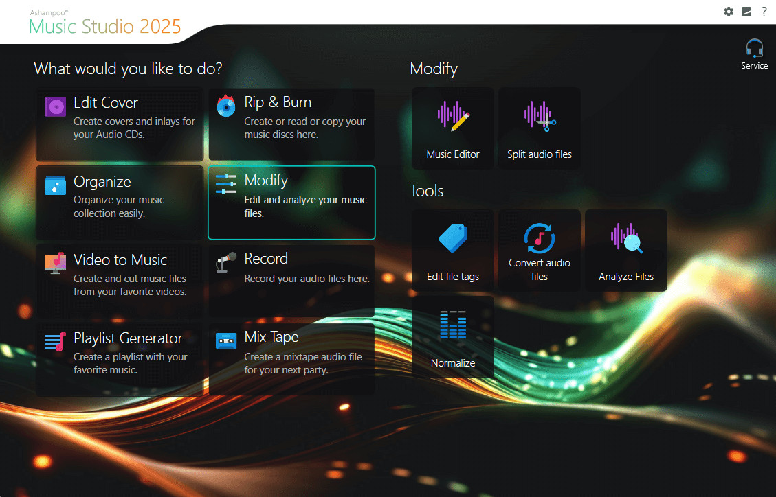 Ashampoo Music Studio 2025 je přehledný a pokročilý editor pro editaci, správu i mixování hudby. Podporováno je rovněž ripování audia z CD i jiných zdrojů a jeho uložení do klasických audio souborů, přičemž je podporováno automatické vyplňování ID3 tagů. Audio soubory lze navíc rozdělovat nebo naopak slučovat.