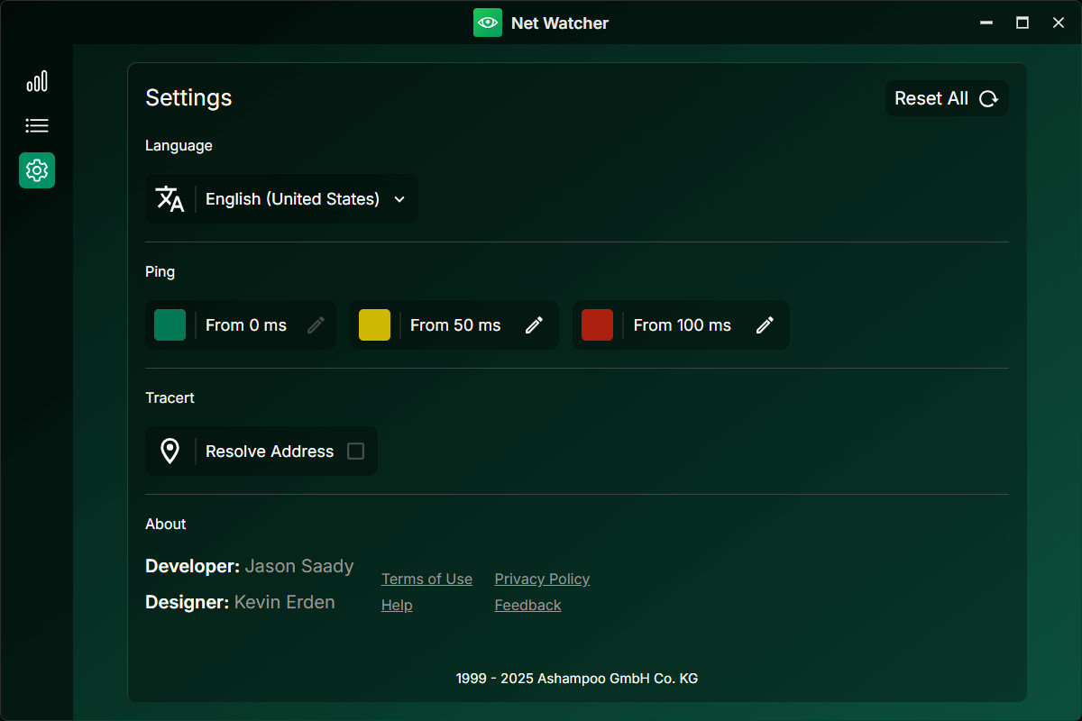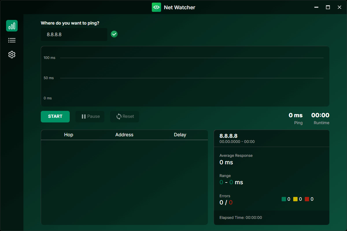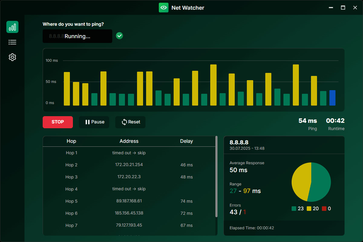 Během testu lze sledovat výkon internetového připojení v reálném čase. Minimální, maximální a průměrné hodnoty "ping" jsou zaznamenávány a prezentovány v přehledném grafu. Uživatel tak může snadno detekovat stabilitu připojení v čase, včetně případných přerušení. Ashampoo Net Watcher také sleduje počet chyb připojení, aby poskytl realistické posouzení problémů se sítí.