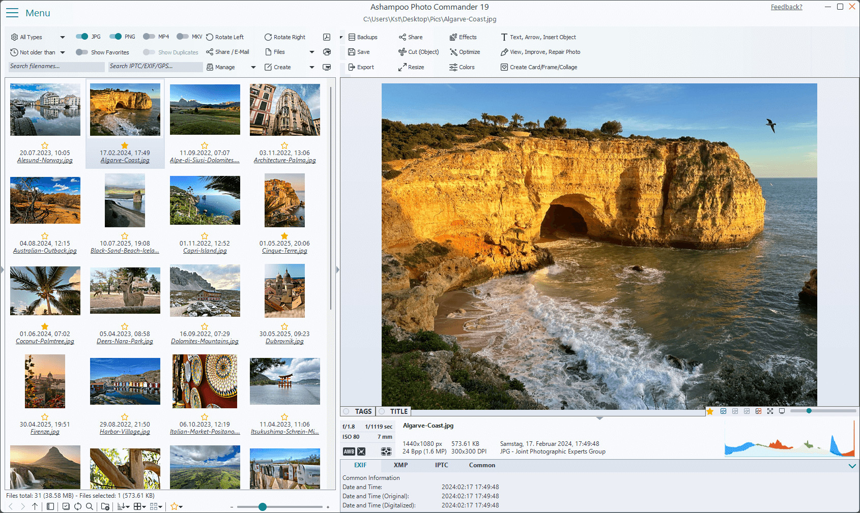 Ashampoo Photo Commander je silný nástroj pro správu, grafickou úpravu, archivaci a editaci digitálních fotografií. Fotografie lze snadno a rychle v příjemném uživatelském prostředí třídit a archivovat pro větší přehlednost. Kromě toho, lze vytvářet a přímo na CD nebo DVD vypalovat animace a slideshow, tisknout indexy obrázků, odesílat obrázky jako přílohu mailu, vytvářet screenshoty a mnoho dalšího. Podpora dávkového zpracování fotografií. Program je k dispozici i ve FREE variantě.
