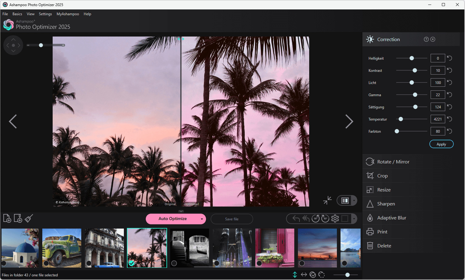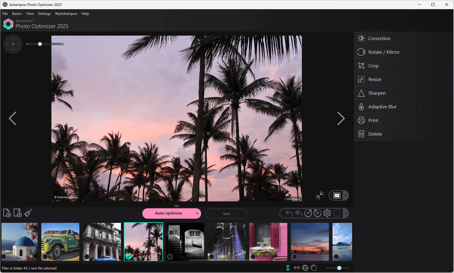 Ashampoo Photo Optimizer je užitečný a kvalitní nástroj pro dávkovou optimalizaci digitálních fotografií. Fotografie lze například zaostřit, upravit jas či kontrast snímků apod. Vše je prováděno automaticky a předností programu je i velmi jednoduché ovládání.