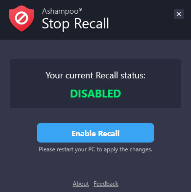 Ashampoo Stop Recall je jednoduchá pomůcka sloužící pro snadnou a rychlou deaktivaci nežádoucí funkce Microsoft Recall ve Windows 11.