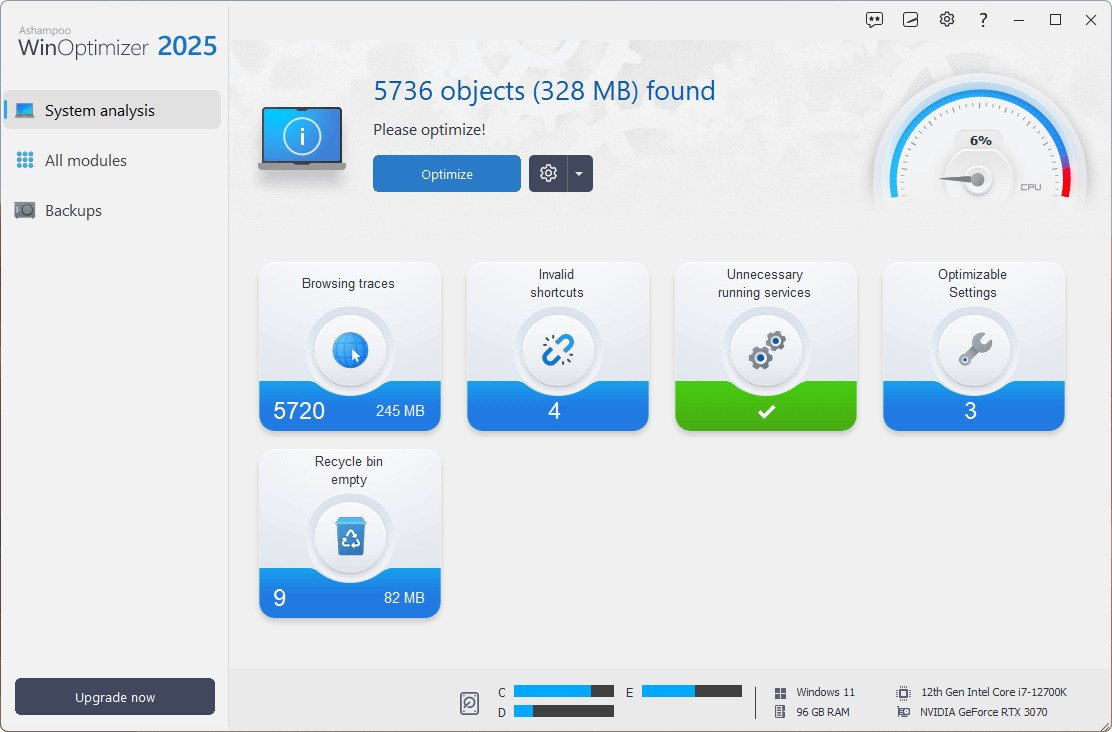 Program Ashampoo WinOptimizer je velice jednoduchý na obsluhu a udržuje váš operační systém v optimálním chodu (oproštěn o součásti, které chod zpomalují a blokují systémové prostředky). K dispozici tak budete mít celou řadu různých nastavení systémových prostředků a nástrojů pro správu, jejichž podrobný popis jasně vysvětluje, co se stane, takže uživatel přesně ví, co dělá.