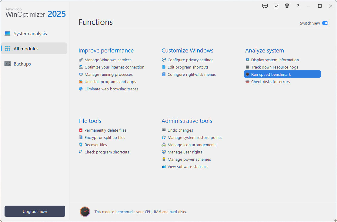 Aplikace obsahuje celou řadu modulů, jejichž pomocí můžete čistit pevný disk, defragmentovat a opravit záznamy v registru, zjistit stav pevného disku, spravovat spuštěné služby a procesy, bezpečně mazat soubory nebo hledat duplicitní soubory a složky.