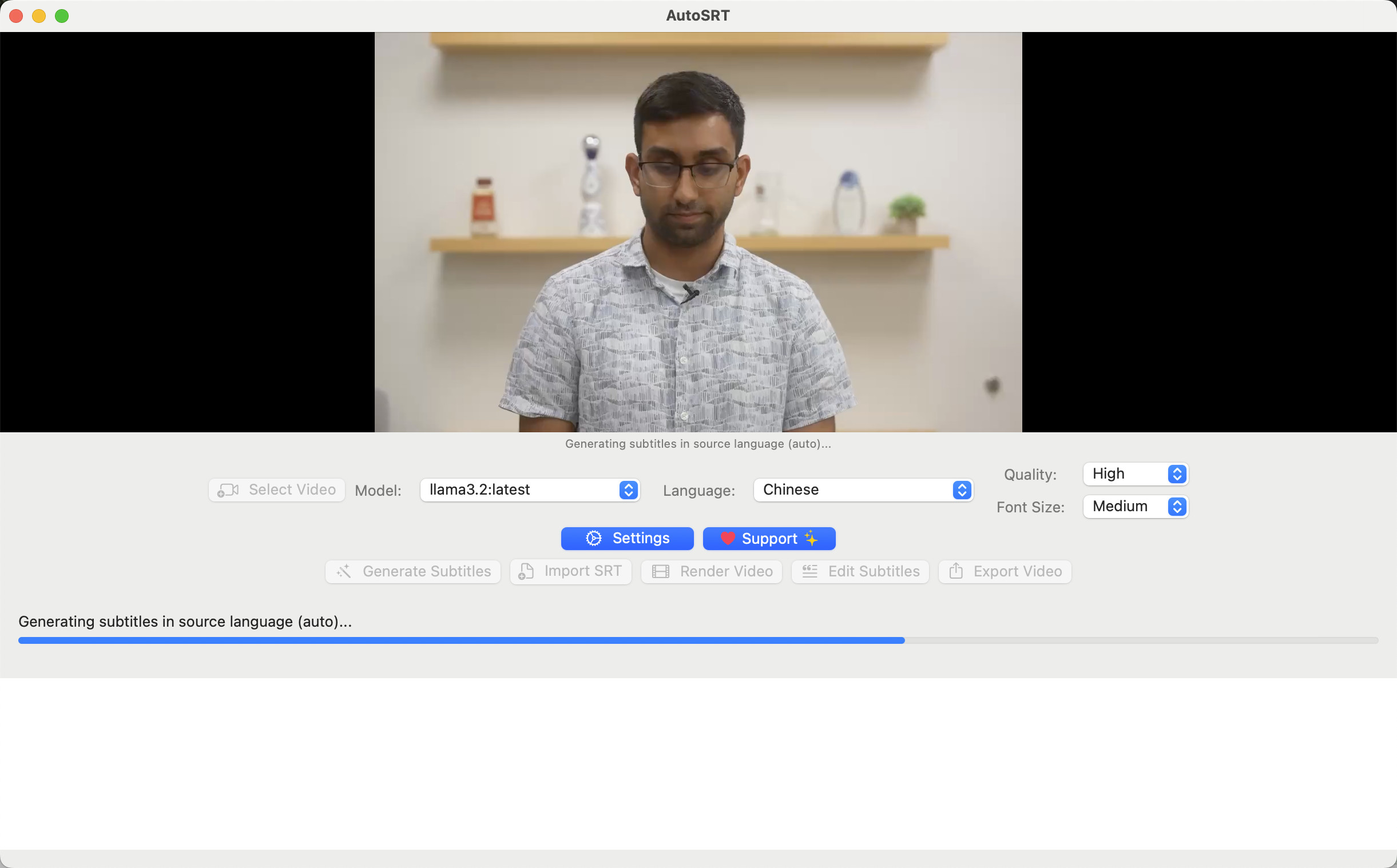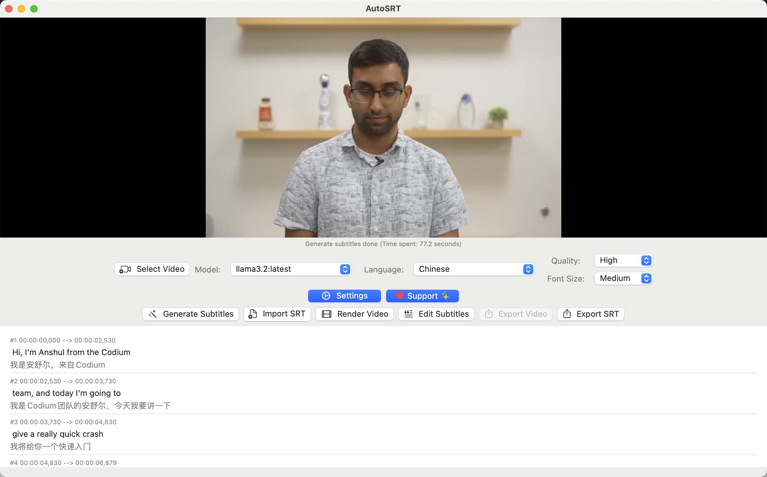 AutoSRT for Mac je nástroj pro automatické generování dvoujazyčných filmových titulků u video souborů pomocí umělé inteligence (AI). Program je tedy možné využít například pro výuku cizích jazyků.