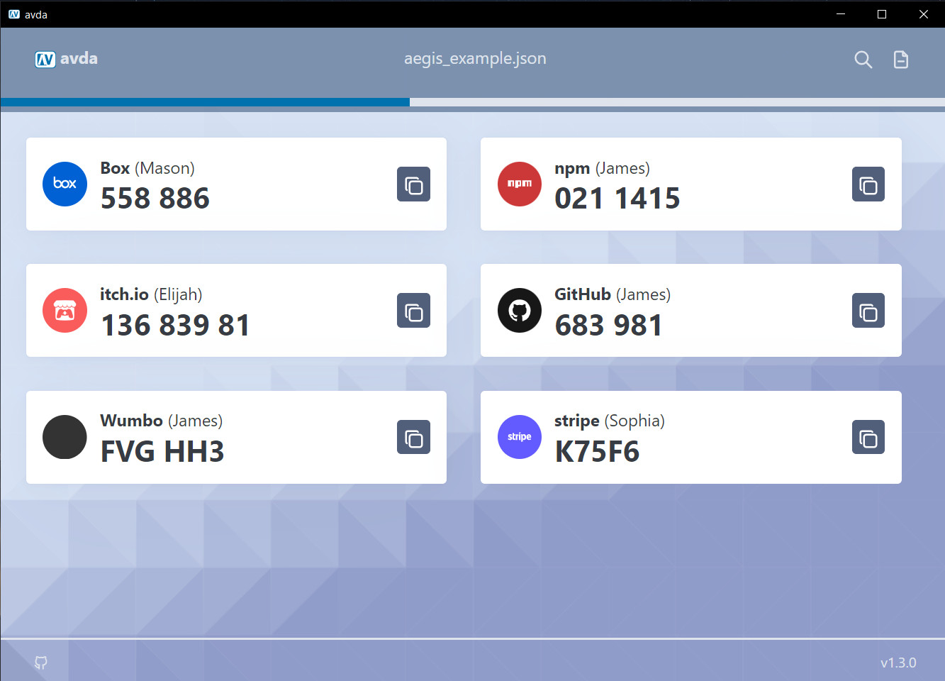 avda (Aegis Vault Desktop App) je nástroj sloužící je generování a zobrazení jednorázových hesel ze záloh nebo exportovaných souborů z aplikace Aegis Authenticator. Nástroj je určen pro přístup k OTP (One Time Password), ale není plnohodnotnou náhradou klasické dvoufaktorové autentizace. Používá moduly pro OTP a je postavena na Wails a Svelte.