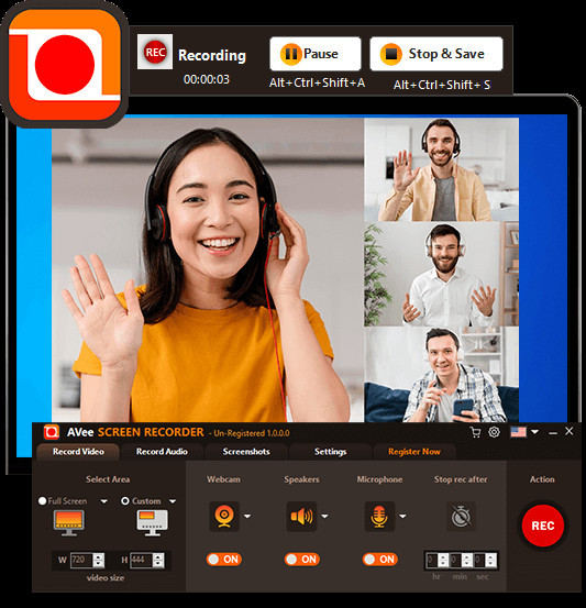 AVee Screen Recorder je profesionální aplikace pro záznam činnosti z obrazovky, záběrů z webové kamery i zvuku z mikrofonu do souborů. Zaznamenat lze i další zvuky nebo hudbu pomocí zvukové karty. Snímat je pak možné celou obrazovku nebo její vybranou část. Program lze využít například nahrávání respektive záznam různých video schůzek nebo vytváření vlastních tutoriálů. Podporováno je i pořizování statických snímků obrazovky tzv. screenshotů.