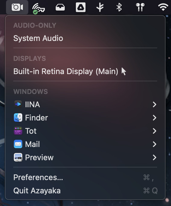 Azayaka for Mac je nenáročný nástroj pro menu bar v macOS, který určený pro záznam dění na obrazovce, aktivního okna nebo systémového zvuku. Video záznamy je možné ukládat do souborů typu MP4 nebo MOV. Audio lze pak ukládat do formátů Opus, AAC a do bezztrátových souborů ALAC a FLAC. Program ke své práci využívá ScreenCaptureKit API.