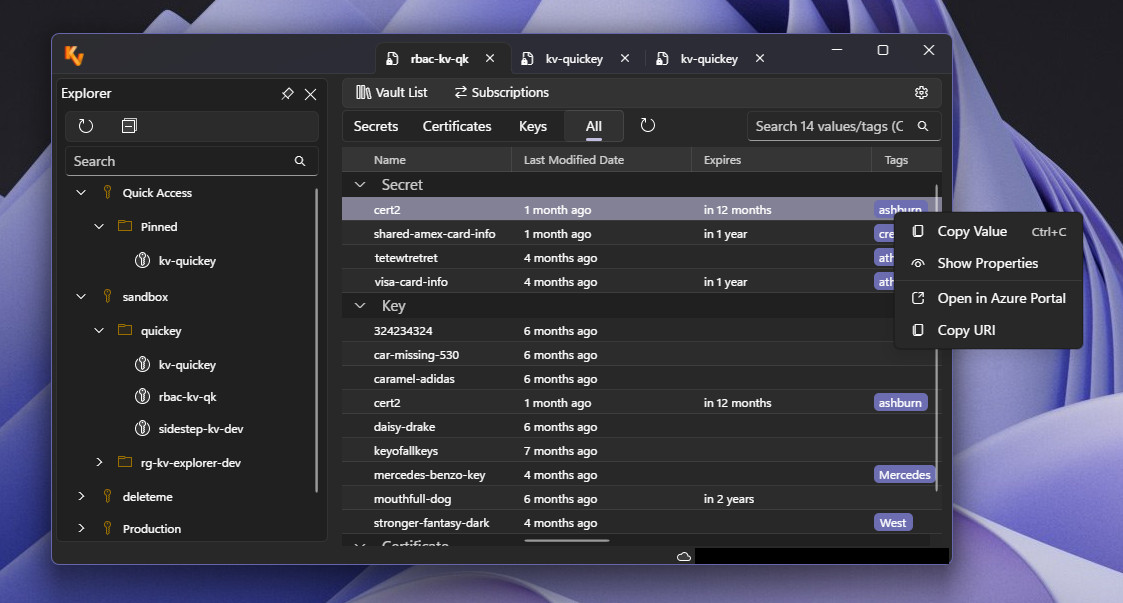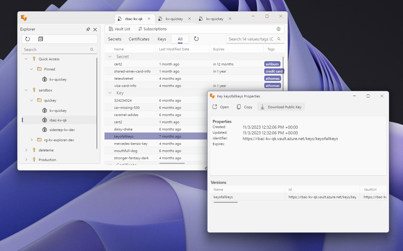 Azure Key Vault Explorer je aplikace určená pro přehlednou správu přístupových klíčů a certifikátů uložených v cloudu Azure Key Vault. Přístup je možný pomocí příslušného Microsoft účtu uživatele.
