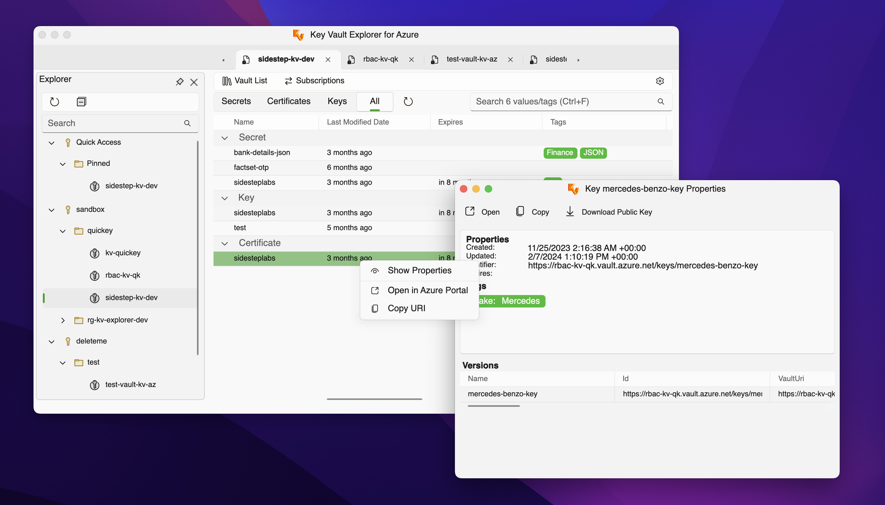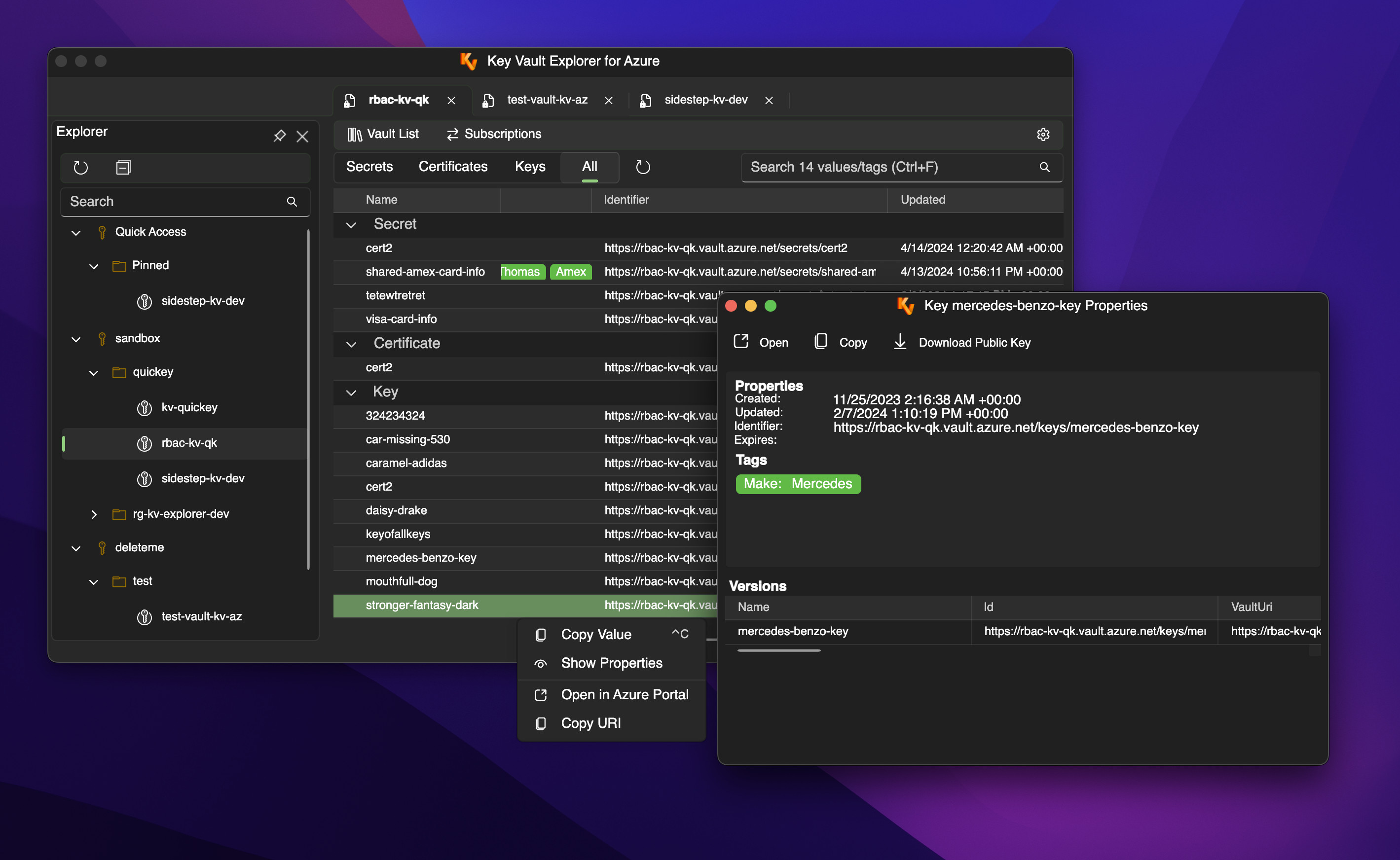Azure Key Vault Explorer podporuje výběr předplatných, která se zobrazí v přehledné stromové struktuře, což usnadňuje navigaci mezi skupinami prostředků a trezory klíčů. Podporováno je také filtrování předplatných, skupin prostředků a trezorů podle názvu. Možné je také kopírovat tajemství do schránky nebo automatické vymazání schránky pro zvýšení bezpečnosti.