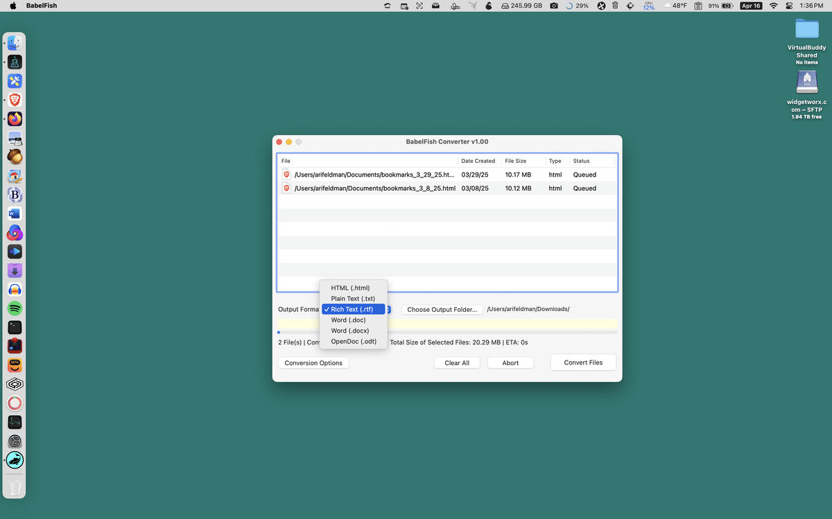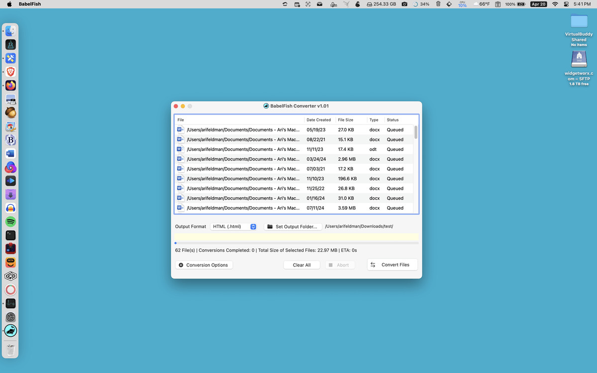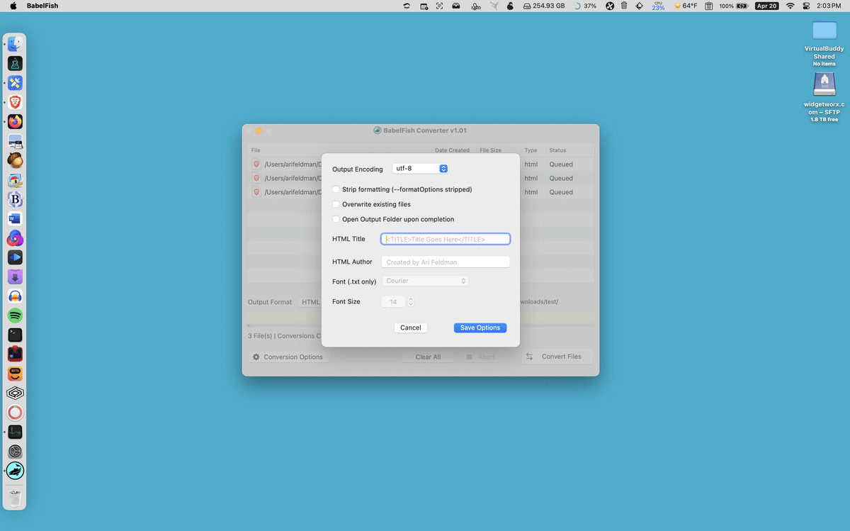 BabelFish Converter for Mac je snadno ovladatelný nástroj pro vzájemnou konverzi dokumentů ve formátech TXT, RTF, HTML, ODT, DOC a DOCX. Konvertovat lze samozřejmě i hromadně všechny soubory ve vybrané složce až v 8 úrovních s možností jejich paralelního zpracování. Při konverzi je zobrazen aktuální čas do konce úlohy.