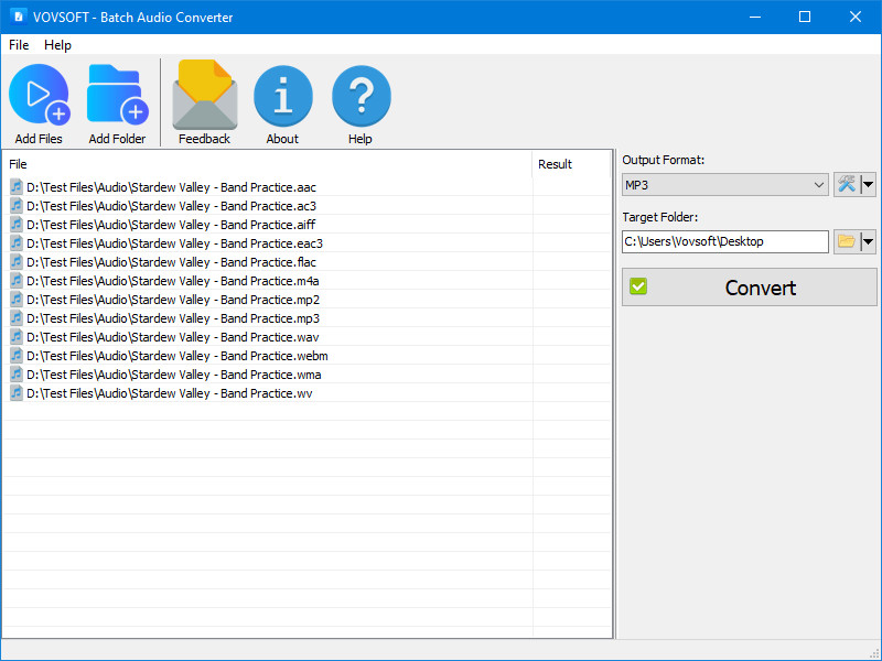 Batch Audio Converter je nástroj pro snadnou hromadnou konverzi všech nejpoužívanějších typů audio souborů. Podporovány jsou sobory typu MP3, WMA, WAV, M4A, AIFF, AAC, OGG, OPUS, AC3, EAC3, MP2, WV, WEBM a FLAC. Při konverzi lze upravit kvalitu respektive datový tok u audio souborů, vzorkovací frekvenci a audio kanály (mono, stereo, 5.1, 7.1).