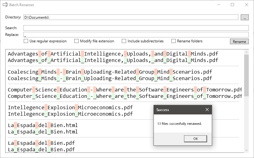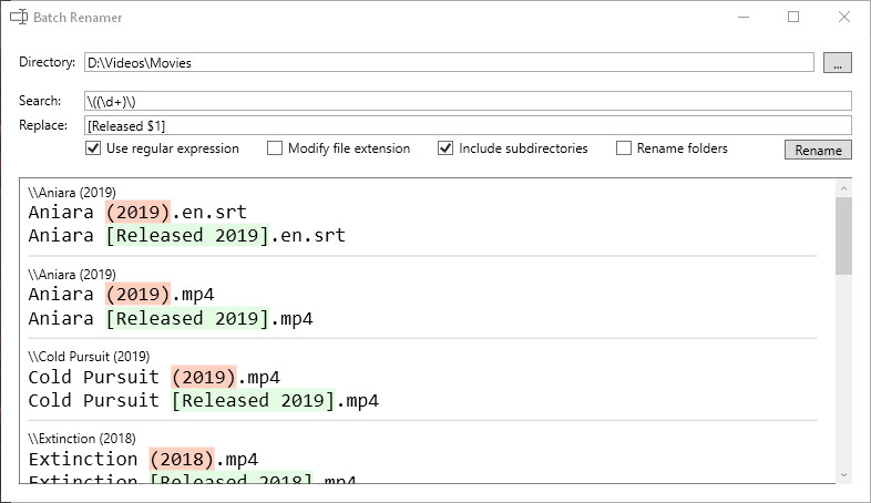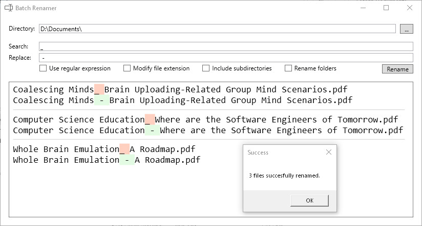 BatchRenamerGUI je pomocník pro hromadné přejmenování souborů dle zadaných kritérií. Uživatel může může velmi snadno nahradit vybraný řetězec znaků za jiný. Podporováno je také použití regulárních výrazů, modifikaci přípon souborů, aplikování změn i pro soubory v podadresářích nebo povolení přejmenování nejen pro soubory, ale i složky.