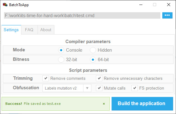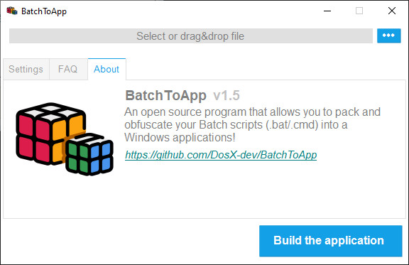 BatchToApp je jednoduchá pomůcka pro zabalení (tvorbu) dávkových skriptů ve formátech CMD a BAT do spustitelných EXE souborů. Program také umožňuje ochranu (obfuskaci) zdrojového kódu. Uživatel může nastavit parametry kompilátoru, jako jsou například režim (konzole, skrytý) a architekturu (32 nebo 64-bit). Odstranit lze také vybrané nechtěné komentáře a nepotřebné znaky.