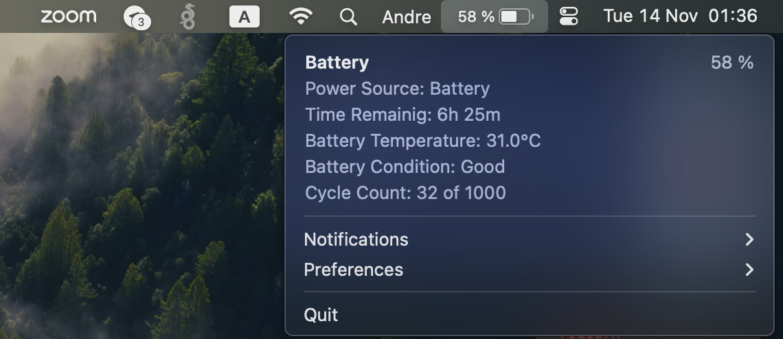 Battery Care for Mac je nenáročný nástroj pro zobrazení aktuálního stavu baterie MacBooku a dalších detailních informací o baterii. Zobrazena je například aktuální úroveň nabití, zdroj napájení, čas do úplného vybití baterie, teplota baterie, zdraví baterie nebo počet cyklů nabití.