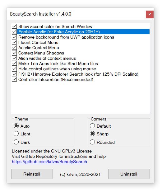 BeautySearch je software pro úpravu vzhledu pole vyhledávání ve Windows 10. Jelikož toto vyhledávací pole je postaveno na webových technologiích, tak jej lze snadno modifikovat vložením vlastního javascriptového souboru. Program BeautySearch tento proces usnadňuje