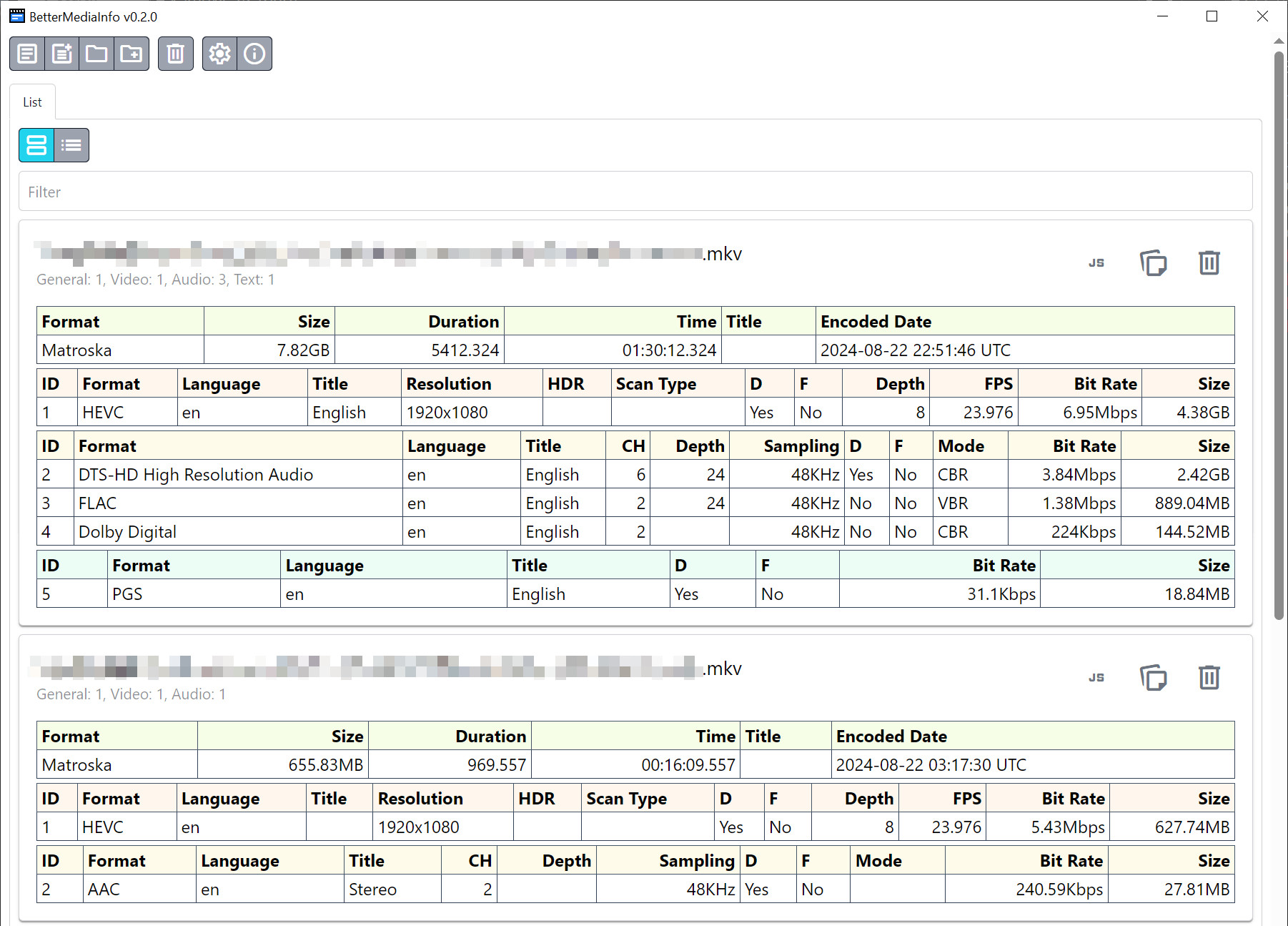 Provádět lze také okamžité filtrování a vyhledávání informací v rámci načtených dat. Program zobrazuje všechny hlavní vlastnosti multimédií jako jsou například přesné trvání, velikost streamu, datový rok (bitrate), typ skenování a mnoho dalších.