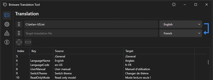 Biniware Translation Tool je aplikace sloužící pro pohodlnější překlad vytvářených aplikací do více jazyků. Program je navržen tak, aby usnadnil a také urychlil proces překladu softwaru pomocí textových překladových souborů, které obvykle obsahují klíčové hodnoty pro každý překladový řetězec používaný v uživatelském rozhraní.