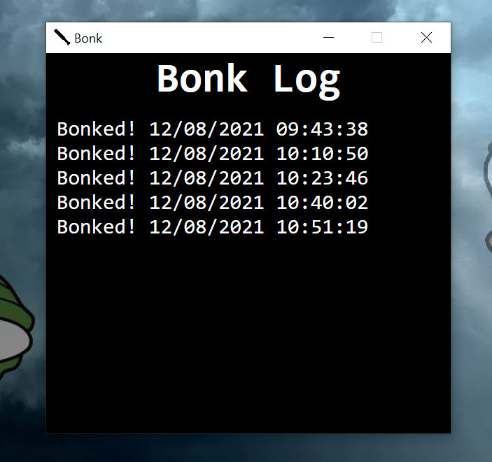 Bonk je jednoduchá pomůcka pro automatické ztlumení reklamy při přehrávání hudby pomocí Spotify. Program se spuštěn na pozadí Windows v oznamovací oblasti a po kliknutí na jeho ikonu je zobrazen seznam událostí.