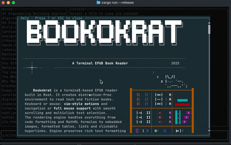 Bookokrat for Linux je nástroj sloužící jako čtečka elektronických knih ve formátech EPUB a PDF v oblasti terminálu. Čtečka umožňuje plynulé procházení, respektive čtení knih, návrat na poslední pozici, práci s obsahem a nechybí detailní čtenářské statistiky.