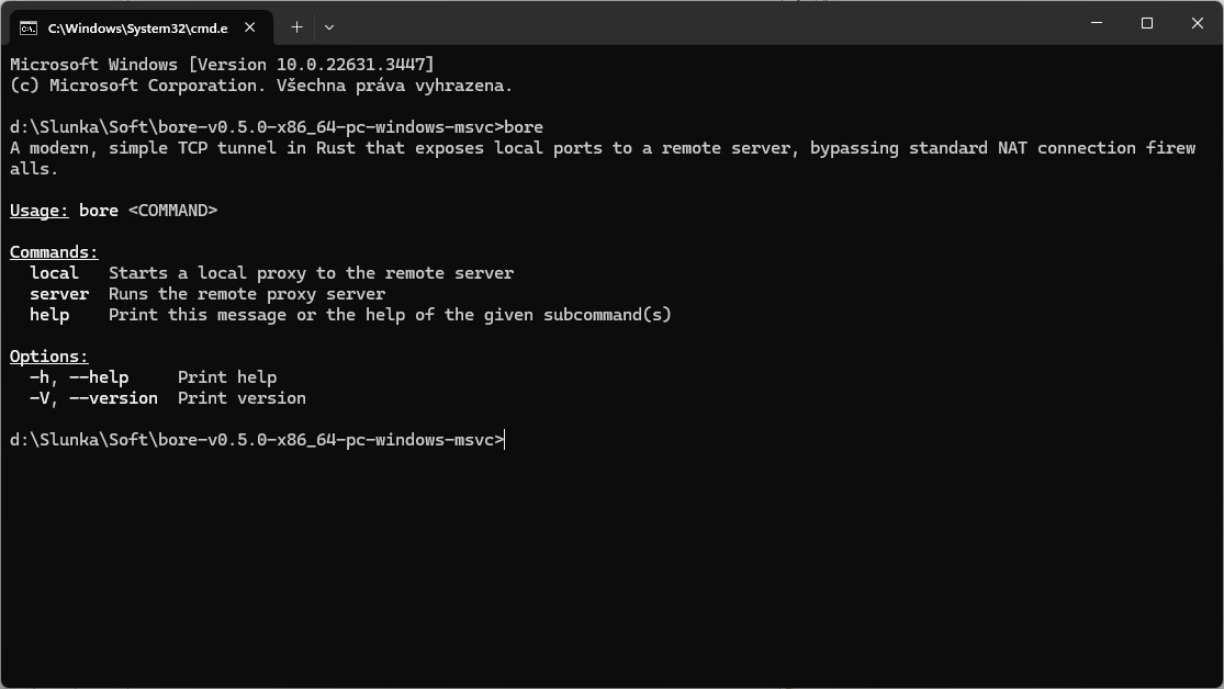 bore je nástroj ovládaný pomocí příkazového řádku (CLI), který slouží pro vytvoření TCP tunelu, který pak zpřístupňuje lokální porty používaného počítače vzdálenému serveru a obchází tak standardní firewally NAT připojení.