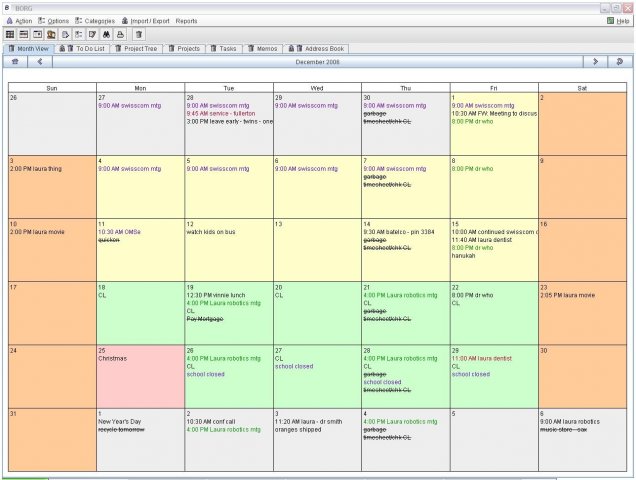 BORG Calendar je přehledný plánovací kalendář a připomínač událostí vytvořený v Javě. Kalenář a přehled událostí je možno i vytisknout a připomínání událostí je možné pomocí pop-up oken nebo automatickým posláním e-mailu na zadanou adresu.