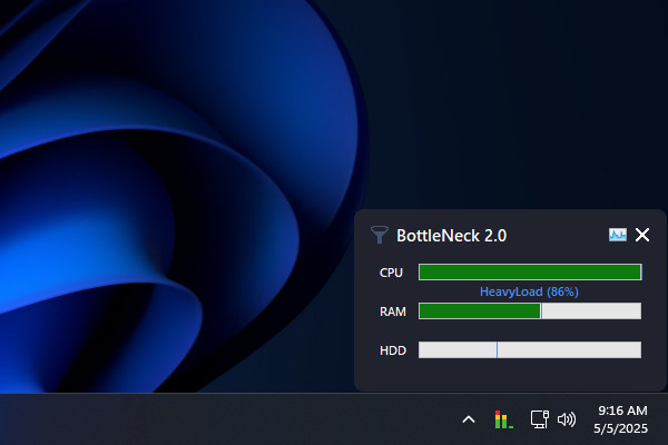BottleNeck je jednoduchý pomocník pro sledování aktuálního vytížení CPU, RAM a HDD či SSD v oznamovací oblasti (system tray) v pravém spodním rohu obrazovky. Nástroj dokáže upozornit potenciální selhání disku na základě S.M.A.R.T. technologie.