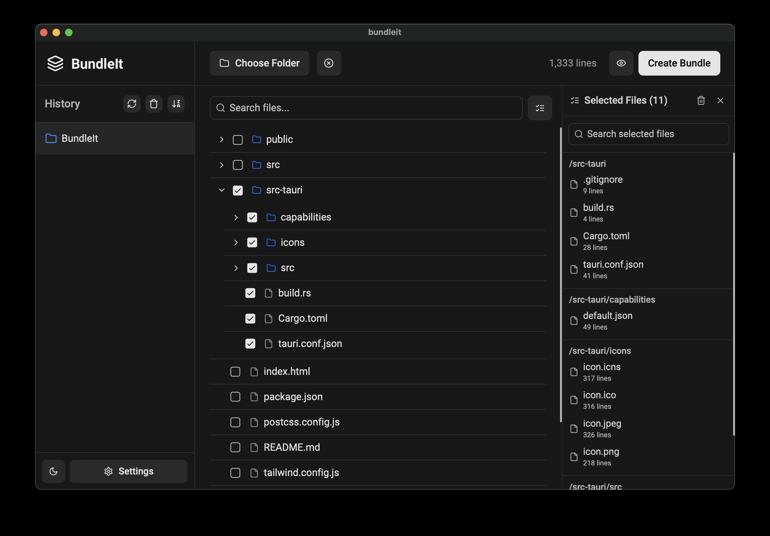 BundleIt je aplikace umožňující přípravu celého projektu do jednoho textového balíčku připraveného k zaslání do AI modelu, což je vhodné například pro rozsáhlé