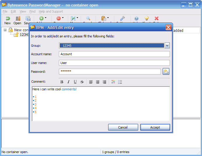 Bytessence PasswordManager je aplikace pro přehlednou správu a bezpečné uložení přihlašovacích jmen a hesel. Uložená hesla jsou chráněna 256-bitovým šifrováním AES. Hesla lze navíc třídit do vlastních tématických skupin a podporován je umort dat z CSV, TXT nebo HTML formátu.
