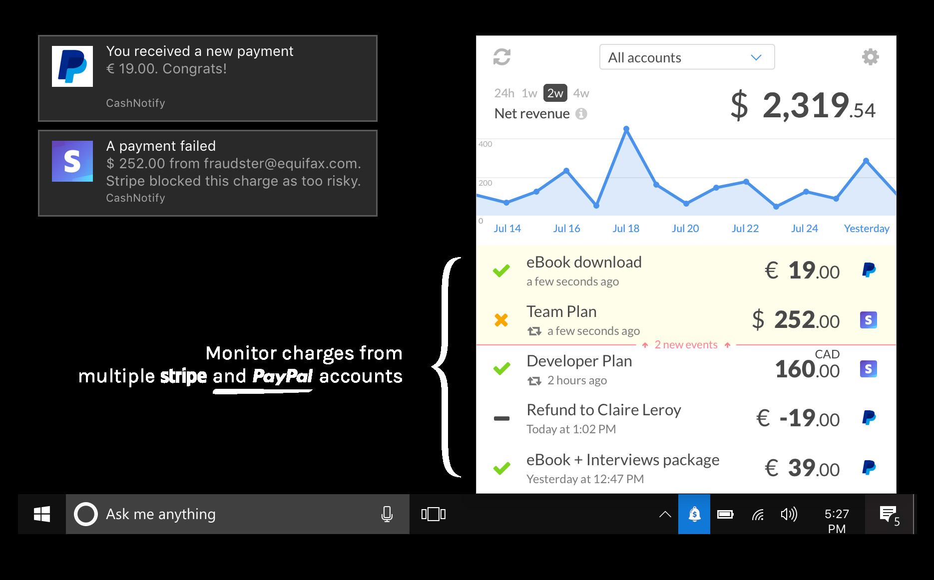 CashNotify je aplikace, která automaticky monitoruje všechny pohyby na účtech Paypal nebo Stripe a odesílá uživateli notifikaci. Samozřejmostí je možnost detailního nastavení, v jakých případech je notifikace zobrazena (příchozí či odchozí platby, nezpracované platby apod. K dispozici jsou také detailní informace o jednotlivých platbách jako jsou například jméno odesílatele, objem přijatých prostředků, poplatky či odkaz na danou platformu (např. Stripe). Podporována je práce s více PayPal nebo Stripe účty současně.