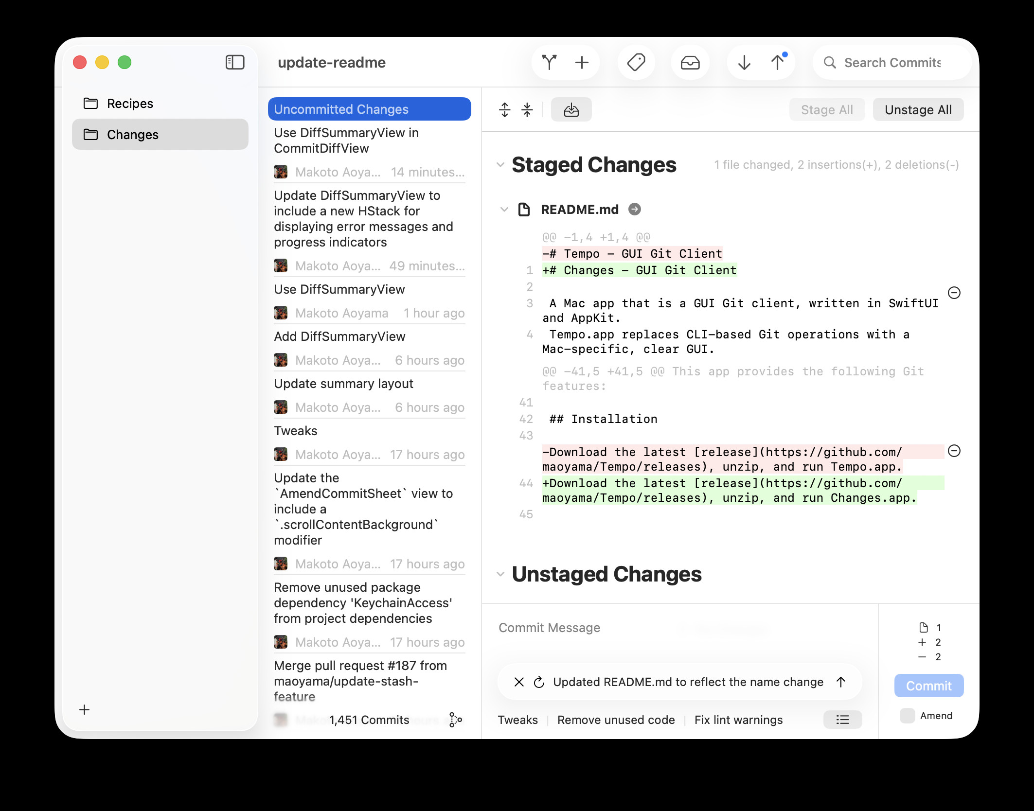 Changes for Mac je přehledný a systémově nenáročný Git klient pro pohodlnou práci s repozitáři v počítačích s macOS. Nástroj umožňuje například tvorbu commitů, úpravu posledního commitu, přidání do commitu jen konkrétní části souborů nebo vrácení provedených změn.