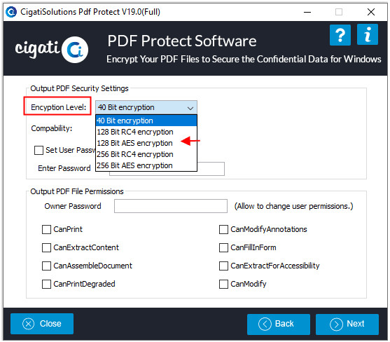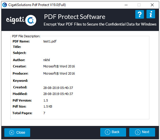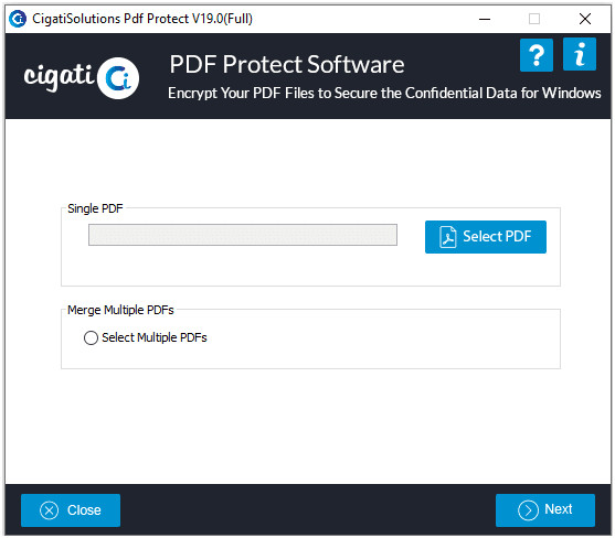 Cigati PDF Protect Tool je aplikace pro zabezpečení vybraných PDF dokumentů pomocí hesel i dalších bezpečnostních parametrů. Program navíc nabízí i možnost editace metadat, které jsou uloženy v PDF souborech. Samozřejmostí je podpora hromadného zabezpečení PDF souborů. Podporovány jsou například šifrování typu 40-bit a 128-bit RC4, 128-bit AES, 256-bit RC4 nebo 256-bit AES.