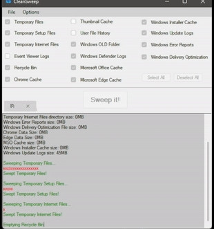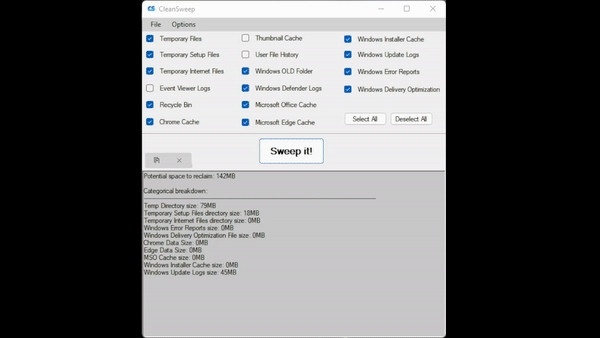 CleanSweep je jednoduchá pomůcka pro odstranění dočasných souborů z pevného disku. Program vyhledá a odstraní dočasné a cache soubory, které vytváří operační systém nebo webové prohlížeče. Vybrané typy souborů lze z mazání i snadno odstranit.