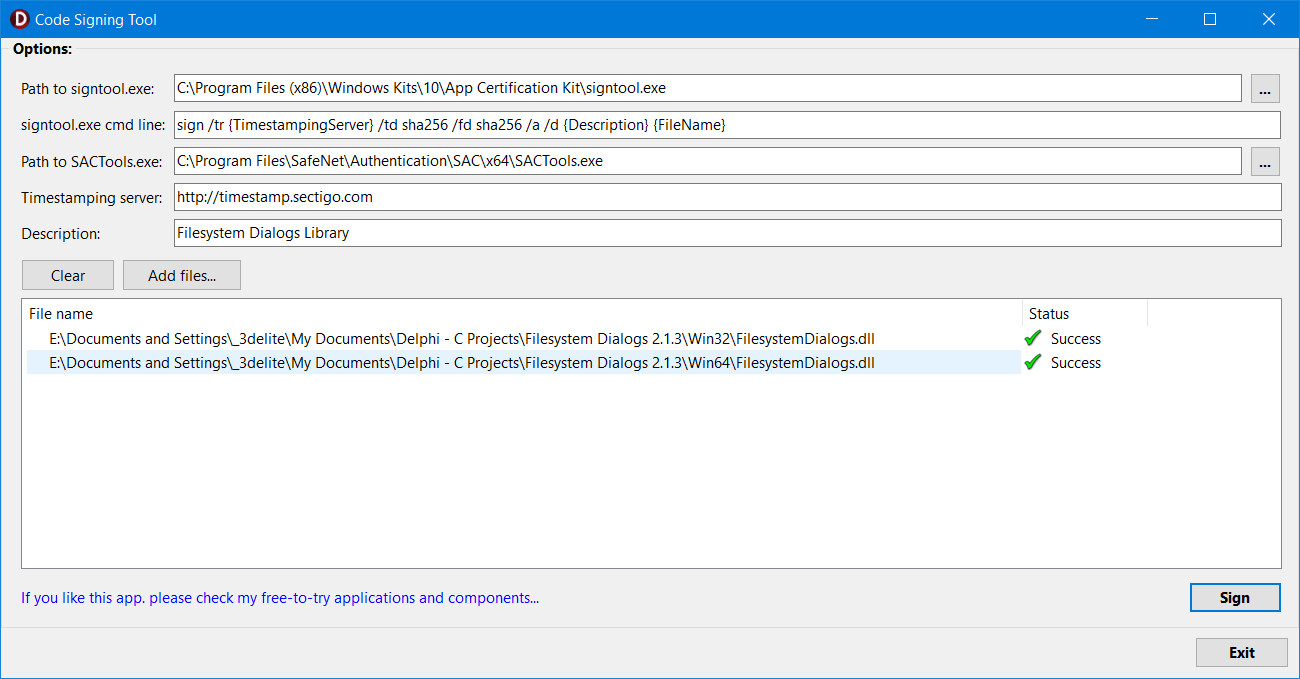 Code Signing Tool je pomocník respektive GUI prostředí pro podepisování souborů typu EXE, DLL a APPX. Při podepisování lze nastavit různé parametry, jako jsou například cesta ke spustitelnému souboru signtool.exe, argumenty příkazu, cesta ke spustitelnému souboru SACTools.exe, adresa timestamping serveru a popis. Možné je i podepisování více souborů současně. Program se neinstaluje.