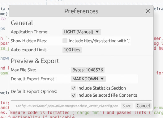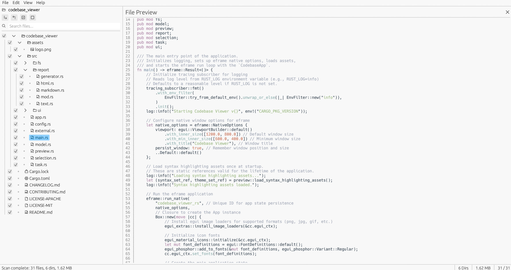 Codebase Viewer je nástroj určený pro skenování, procházení a dokumentaci / export rozsáhlých kódových základen, respektive databází. Program umožňuje paralelní procházení adresářů s podporou .gitignore, skrytých souborů a více vláken.