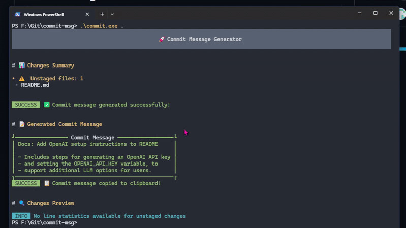 commit-msg je nástroj ovládaný pomocí příkazového řádku, který dokáže generovat commit zprávy, respektive popisy změn v Gitu za pomocí umělé inteligence (LLM). Nástroj v podstatě provede analýzu změn v repozitáři a sám navrhne stručný a smysluplný text pro commit, přičemž využívá LLM modely Gemini, Grok, Claude nebo ChatGPT. Vytvořený text commitu je také automaticky zkopírován do schránky.