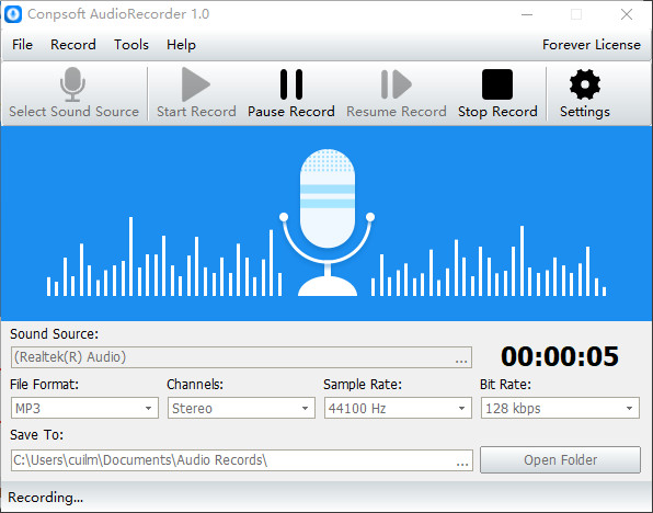Conpsoft MP3Recorder je přehledný a snadno ovladatelný nástroj sloužící pro záznam zvuku v počítači do audio souborů v reálném čase s možností záznamu v původní kvalitě. Záznam lze provádět i z více zdrojů současně a to do audio souborů typu MP3, WAV nebo WMA. Samozřejmostí je možnost nastavení kvality (vzorkovací frekvence, datový tok) výstupních audio souborů.