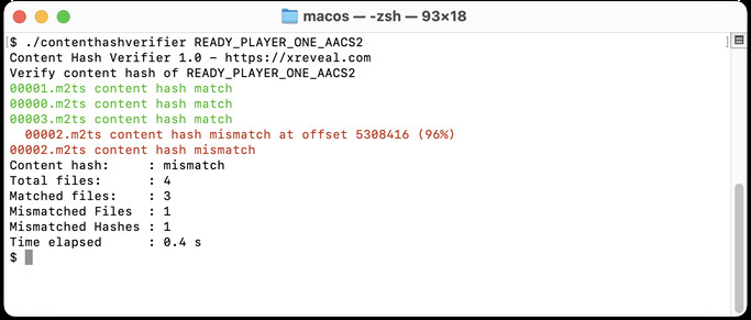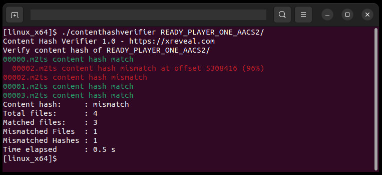 ContentHashVerifier je nástroj ovládaný pomocí příkazového řádku (CLI) , který je určen pro verifikaci obsahového hashe i BD (Blu-ray) nebo UHD (Ultra HD Blu-ray) disků. Podporovány jsou hashe SHA1 (BD) nebo SHA256 (UHD) pro surový /BDMT/STREAM/*.m2ts nebo nedešifrovaný .m2ts soubor. Nástroj je určen zejména pro ověření čitelnosti M2TS souborů.