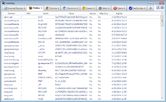 CookieSpy je přehledný a pokročilý prohlížeč cookies souborů všech nejpoužívanějších internetových prohlížečů. Zobrazeny jsou všechny typy těchto záznamů (HTTP cookies, internet cookies, web cookies nebo simply cookies). Cookies soubory lze navíc prohlížet v přehledných záložkách dle typu webového prohlížeče.
