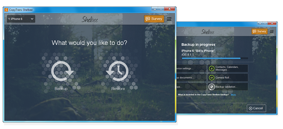 CopyTrans Shelbee je aplikace pro snadné zálohování a případnou obnovu dat z iPhone a dalších mobilních zařízení s operačním systémem iOS. Zálohovat lze aplikace, dokumenty, zprávy, kontakty, obsah kalendáře, fotografie, videa a další obsah. Aplikace si ukládá kompletní historii zálohování a zálohovaná data je možné ochránit pomocí hesla. Existuje zde možnost klasického i přírůstkového zálohování.